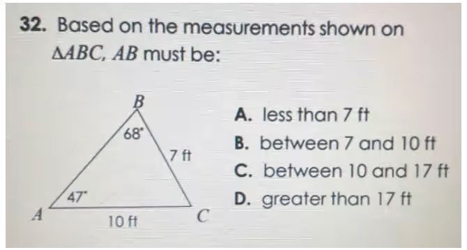• 32. Based on the measurements shown on △ABC, AB must be: A. less than 7 ft B. between 7 and 10 ft C. between 10 and 17 ft D. greater than 17 ft