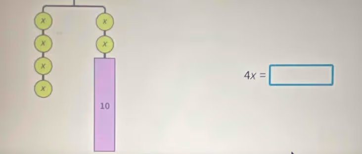 The image shows a balance scale representation. On the left side, there are four circles labeled “x”. This represents $$4x$$ - Identify the components on the right side of the equation.
